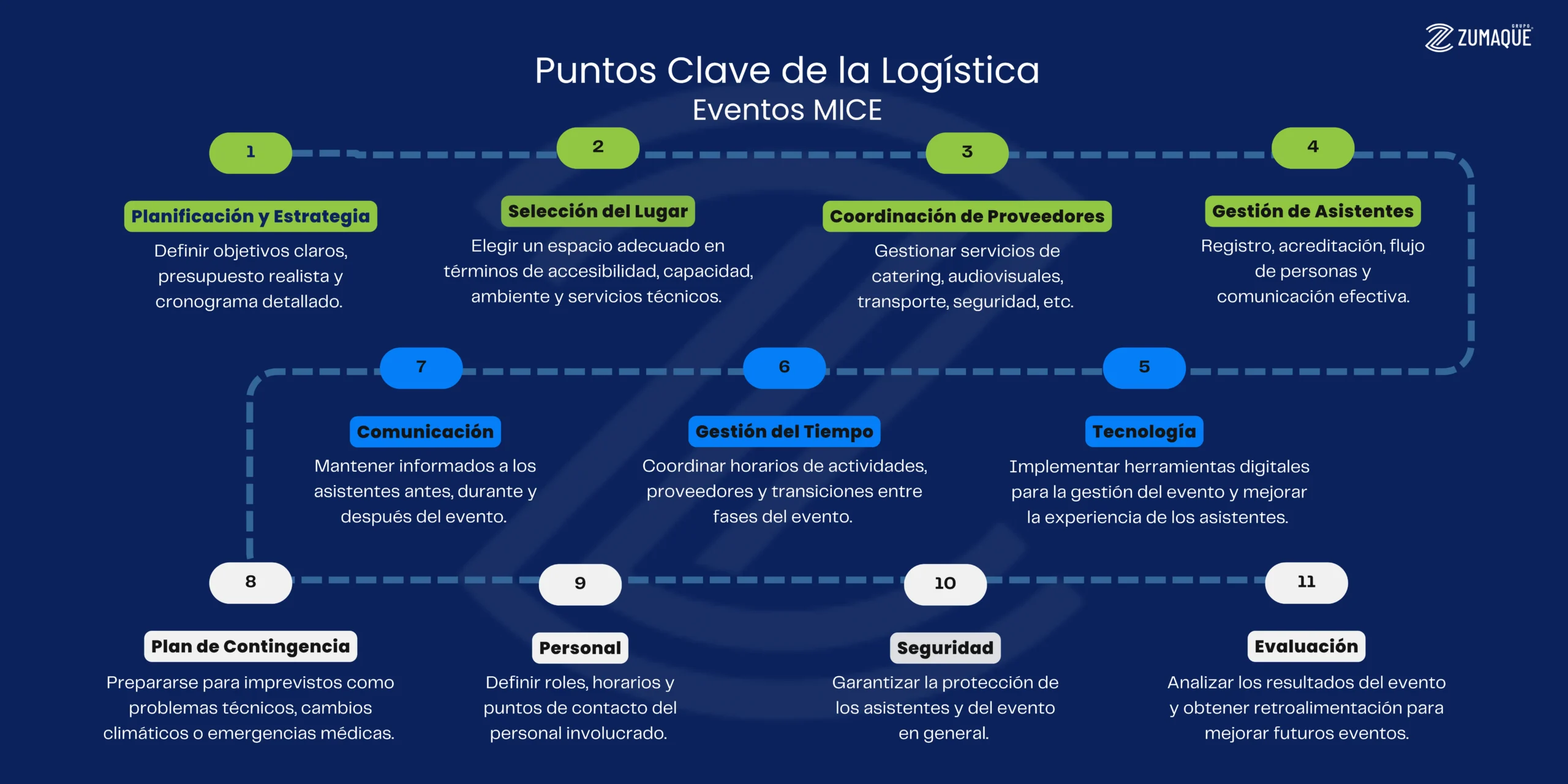 Tal como se refleja en la imagen anterior, la logística para un Evento MICE es una orquesta compleja donde cada instrumento debe sonar en perfecta armonía. La gestión de estos puntos clave no es una tarea menor, y su correcta ejecución marca la diferencia entre un evento bueno y uno verdaderamente excepcional.